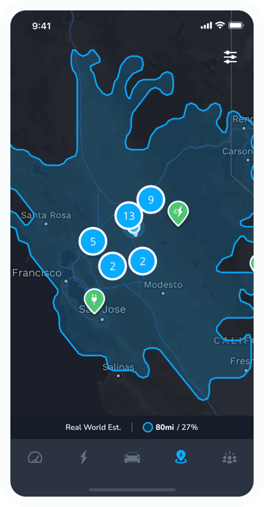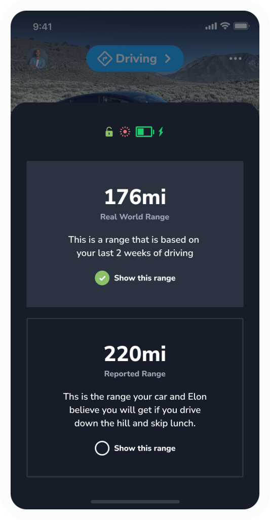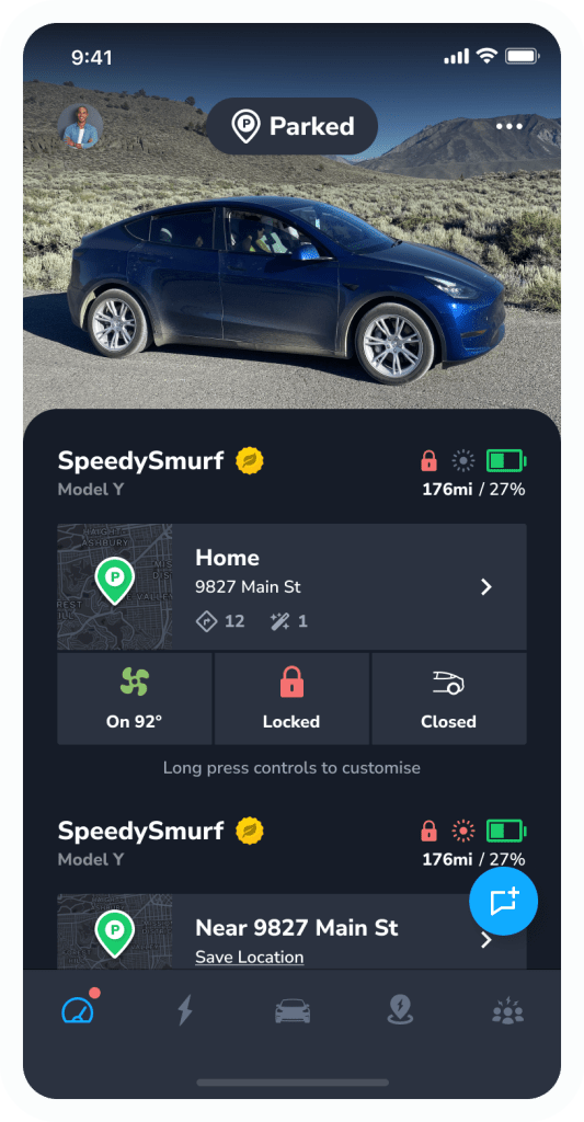 Get über-accurate info on your Tesla’s range based on your real driving efficiency, as well as location info, climate controls, and car controls.