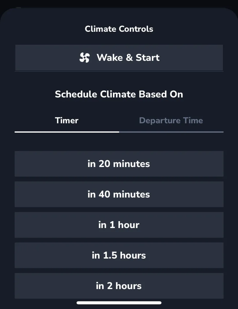 - Schedule climate based on a Timer or Departure Time: