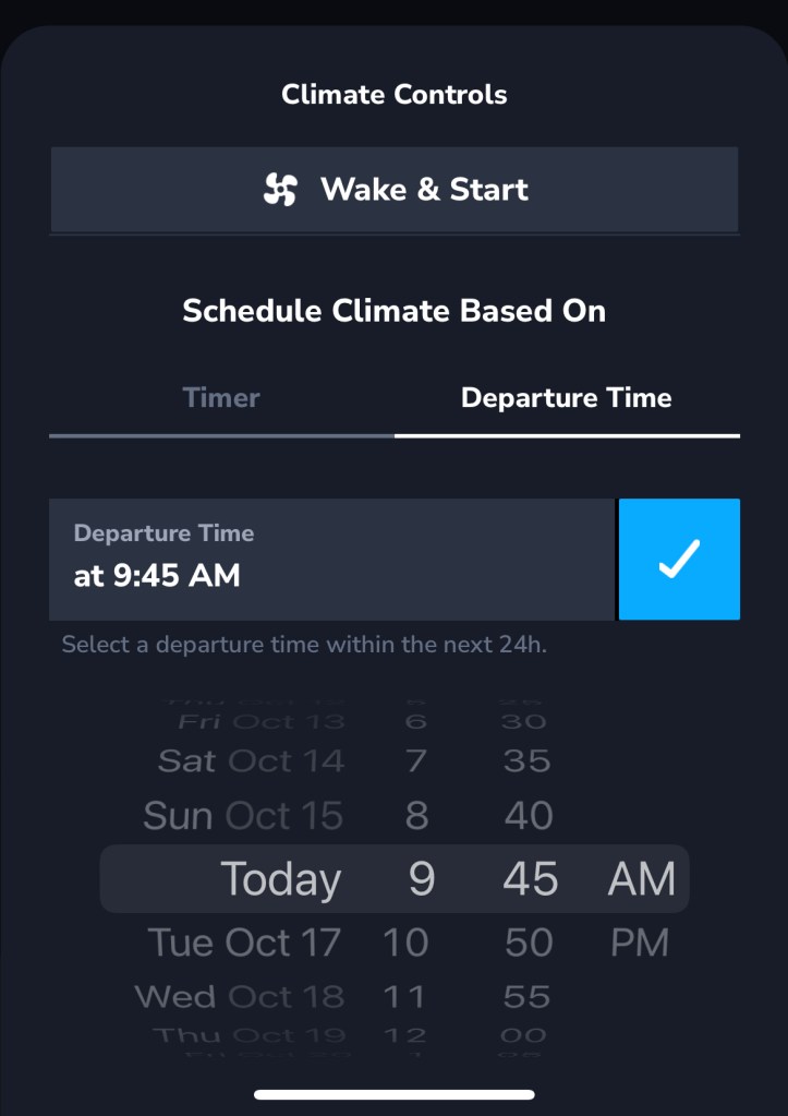 Toggle to Departure Time to schedule climate at a particular time in the next 24 hours (ex. 11:30am tomorrow).