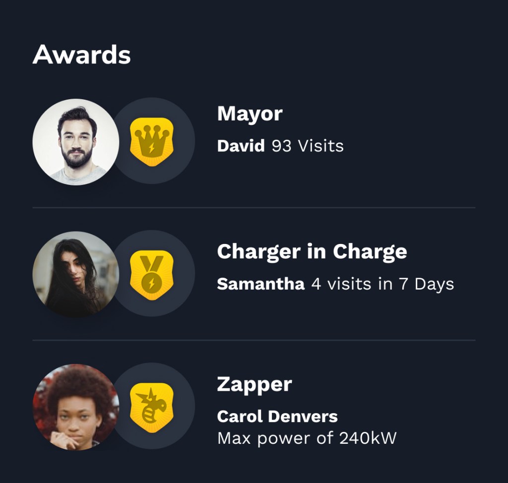 - Charger in Charge: awarded to the most frequent visitor in 7 days