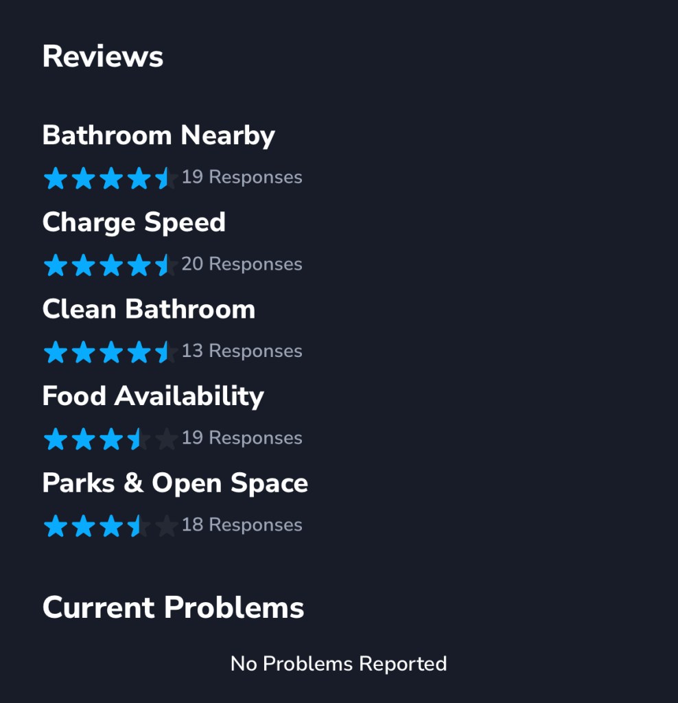 See responses to whether or not there’s a bathroom nearby, how good the charging speed is, whether or not the bathroom is clean, the rating of food availability nearby, and experience with parks and open space.
