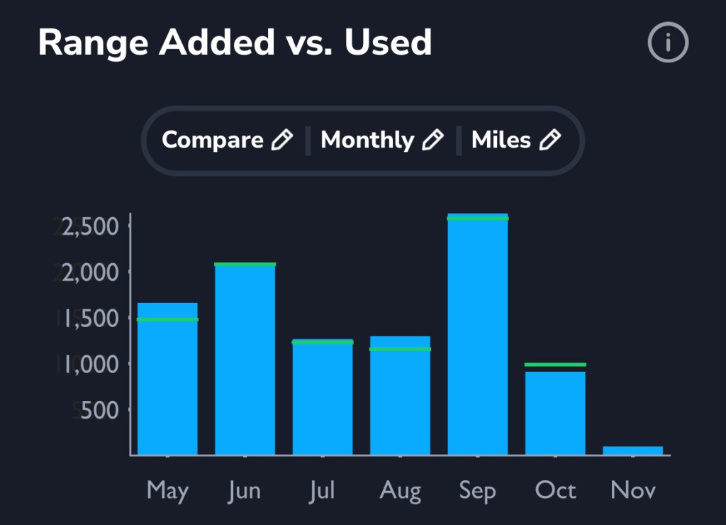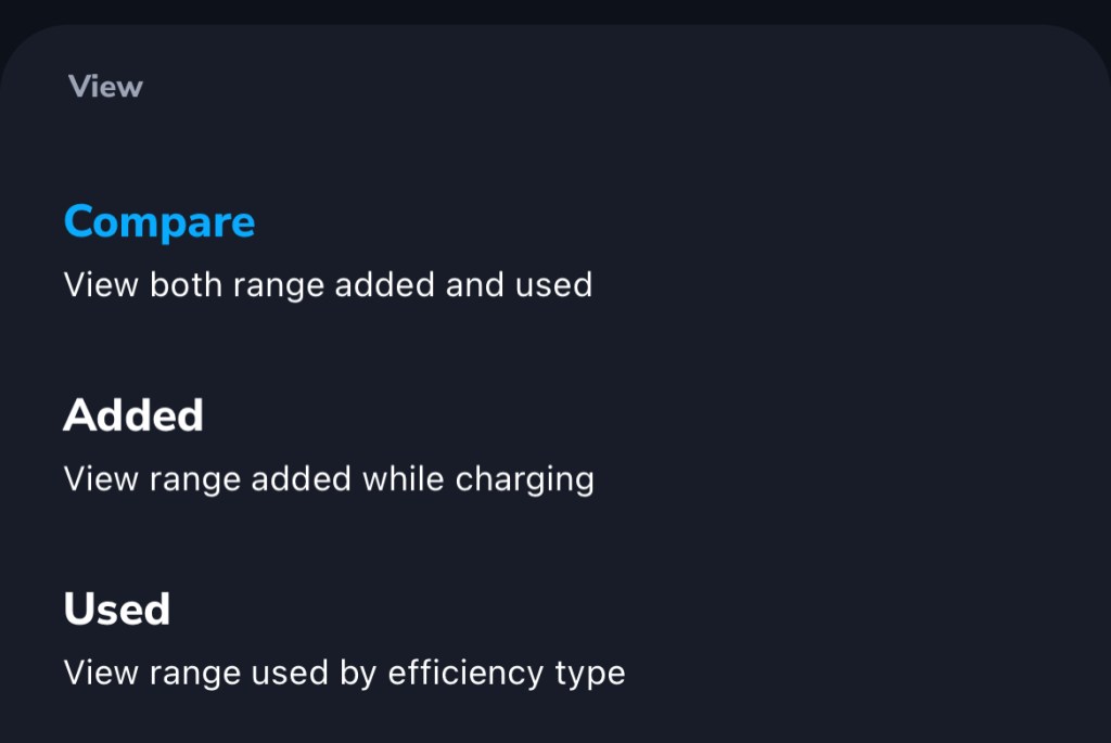 Stick with “Compare” mode to view both range added while charging, and range used.